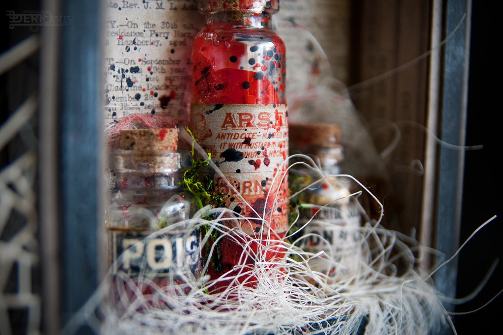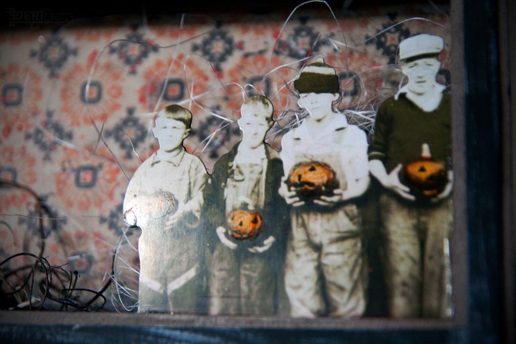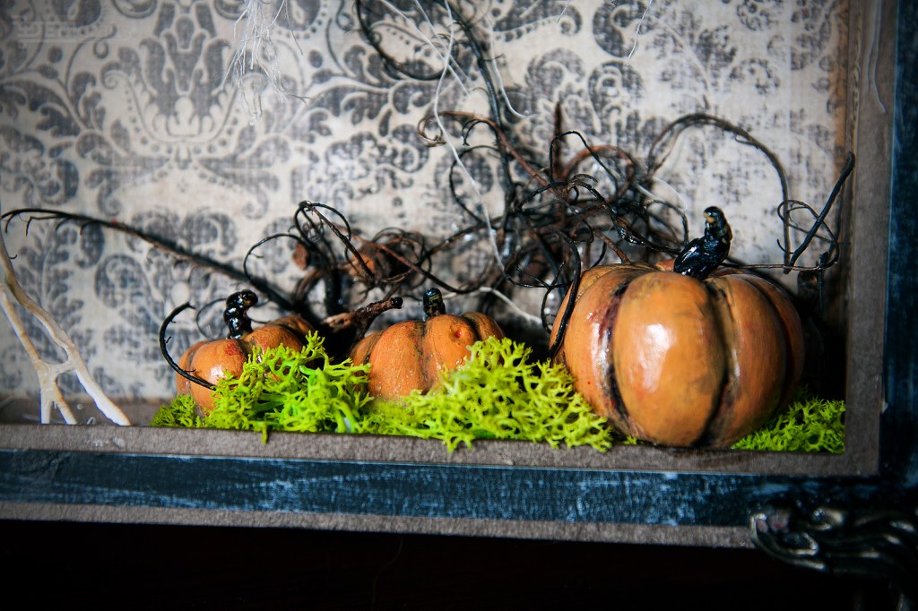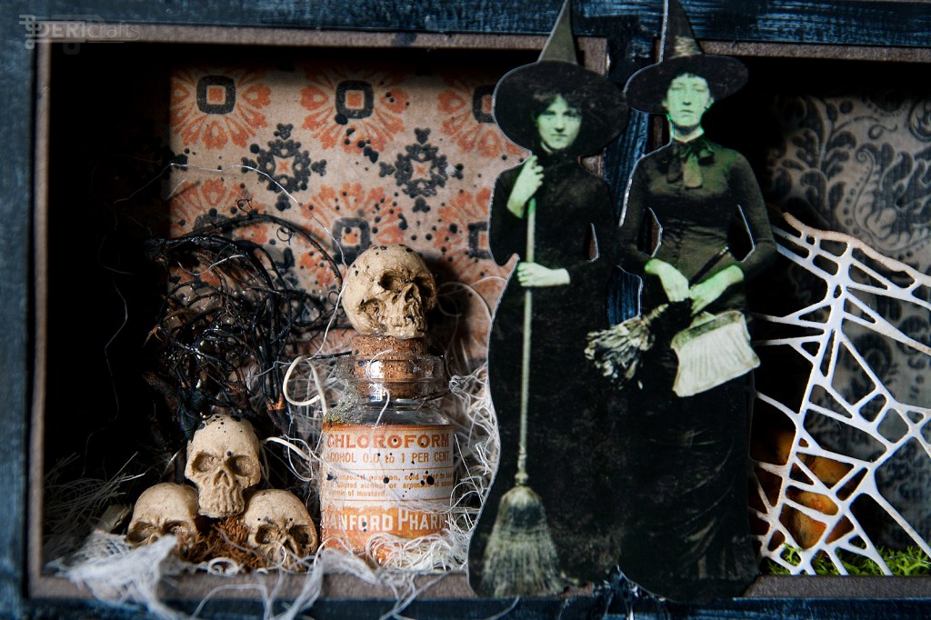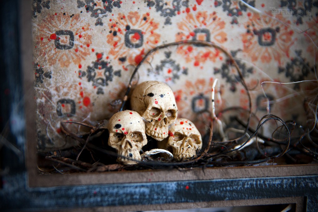 Halloween is just around the corner, so as every year I decided to prepare some decorations for this occasion. Although I do not celebrate this holiday myself, I love to make cards and decorations in this theme. This year, I decided to finish last year’s project, a box full of “horrors”;). Last year I had done pumpkins from modeling mass and as also put together a shadow box and painted it. Almost all the elements I used in presented box, came from different collections of Tim Holtz – from casting skulls, through paper dolls to decorative papers. In addition, some elements – such as a house and a witch and bottle stickers – are stamped elements from various editions of Tim Holtz and Stampers Anonymous stamp collections.