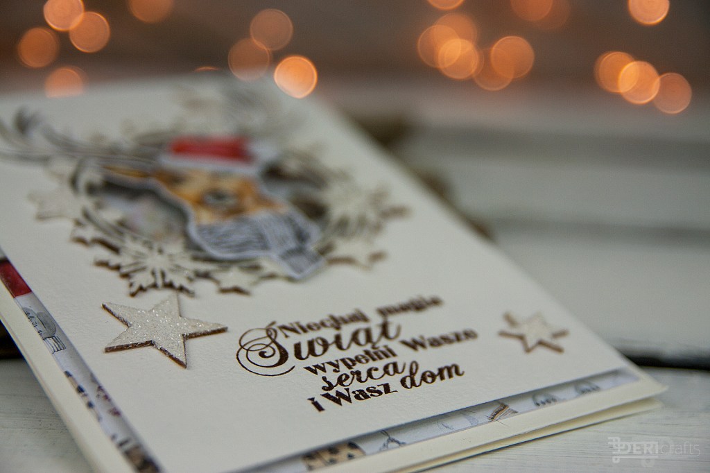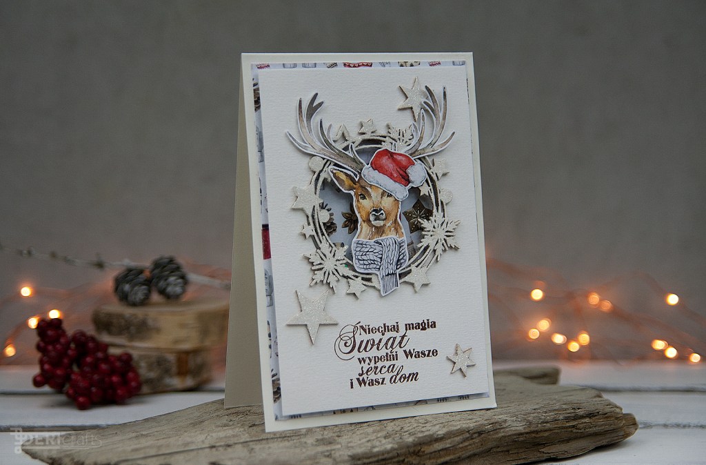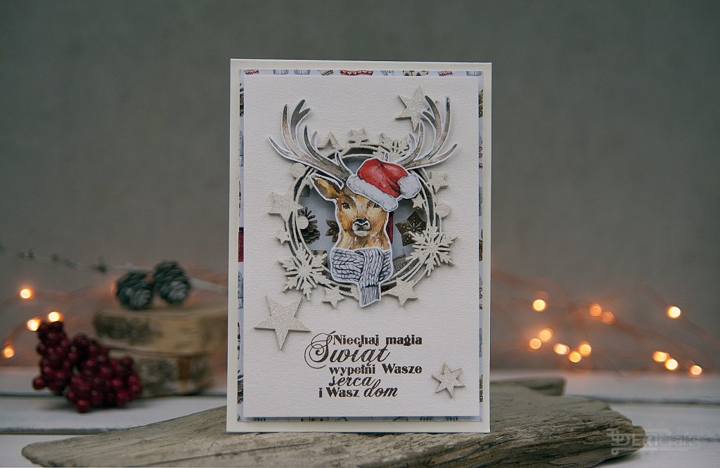 Today I have for you a Christmas card with an interactive element in the form of a shaker box. The frame is a cutout from Agateria Craft, as is the stamp with the inscription. The rest of the elements, ie the background and the main decorative element – deer, are elements of P13 (Piątek Trzynastego) papers from the “Christmas treats” collection. I mounted all card elements on a stable base from Rzeczy z Papieru company and the Christmas card is ready. If you want to make such a card by yourself, all the elements I have used to create presented card, are available in the Zielone Koty shop.