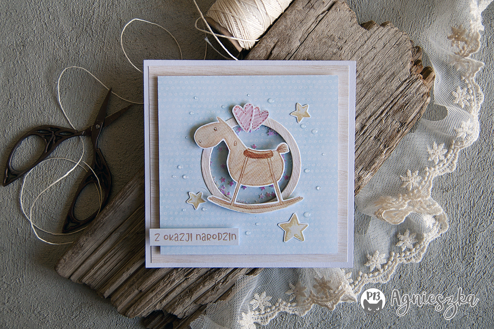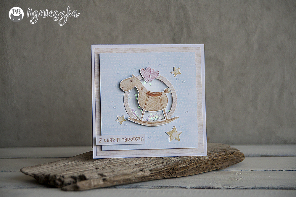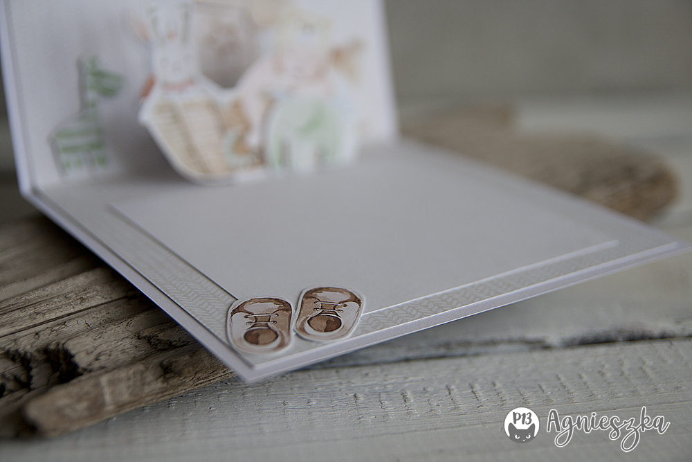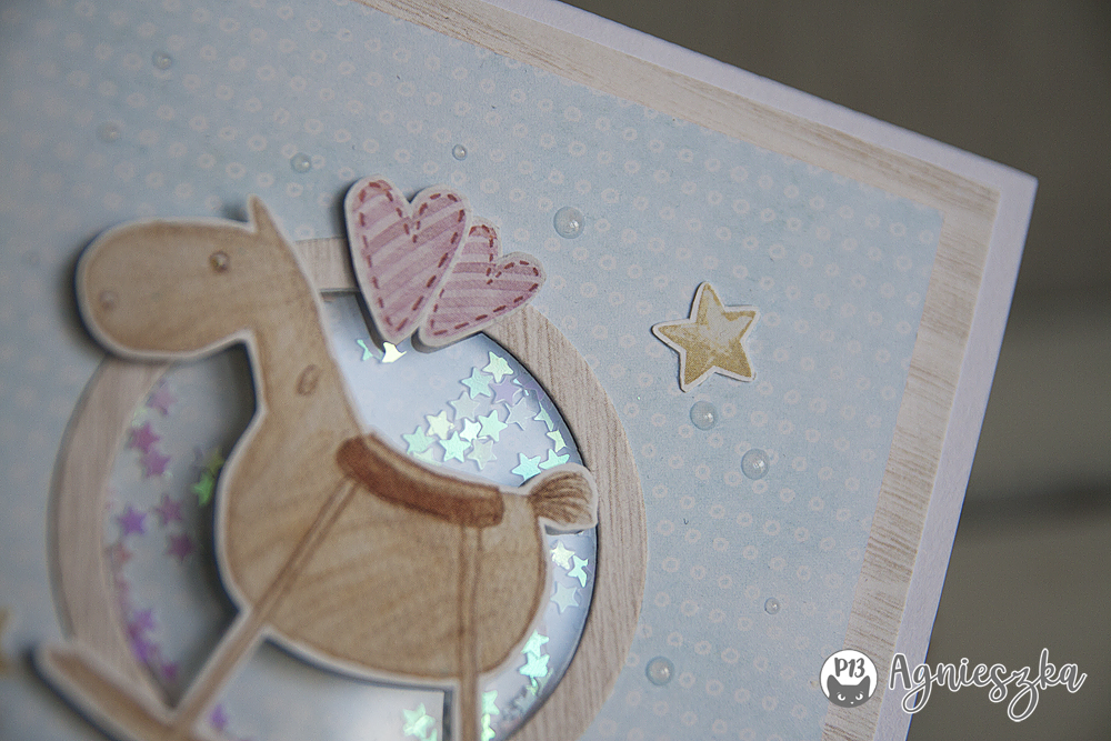 Kolejna moja inspiracja dla Was to interaktywna kartka, z dwoma mechanizmami: shaker na przodzie oraz pop up w środku kartki, którą wykonałam w całości z papierów z kolekcji Baby Joy. Tym razem, oprócz fotografii pracy przygotowałam dla Was tutorial.