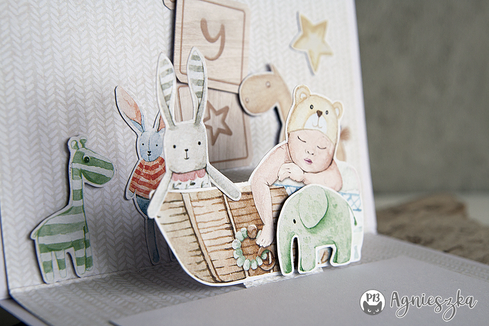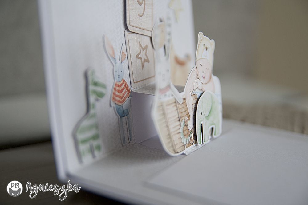 My another inspiration for you, is an interactive card with two mechanisms – a „shaker” on the front and „pop up” in the middle of the card, which I made entirely of paper from the Baby Joy collection. This time, in addition to the card’s photographs, I have prepared a tutorial for you.
