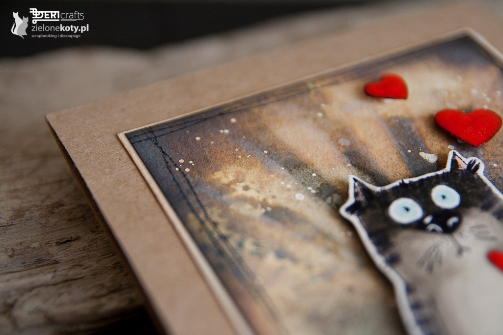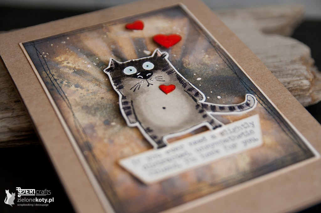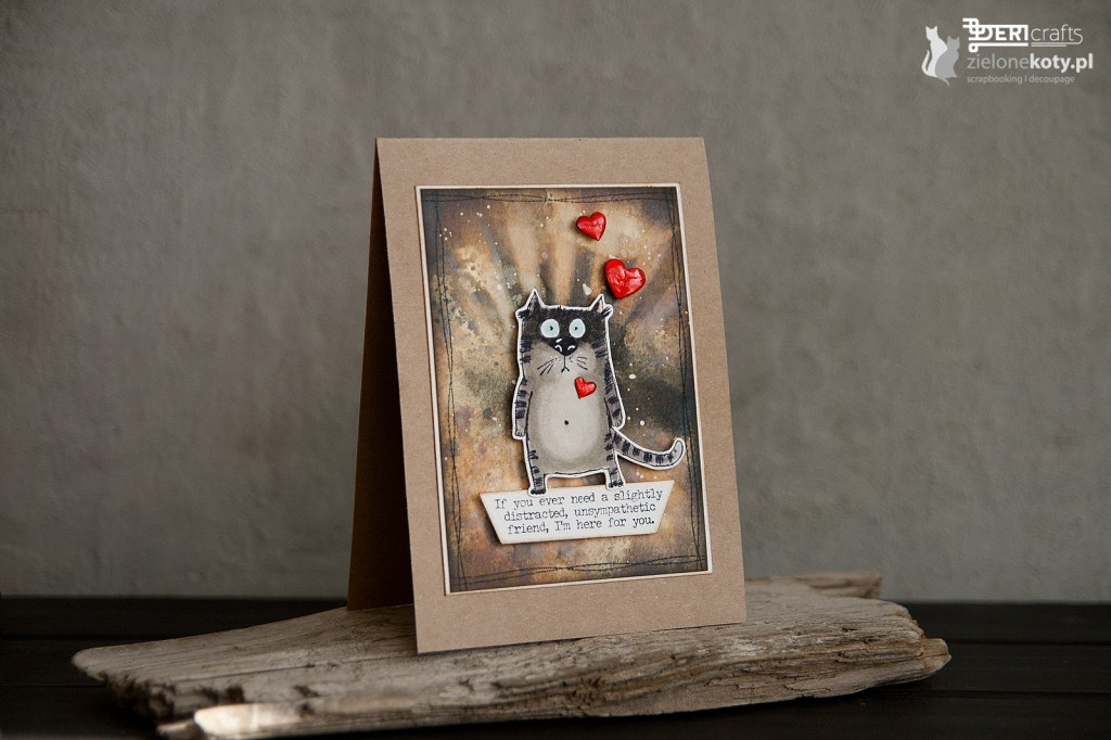 Today my inspiration for you is a card for unusual occasions, for example to make a new friendship. I have to admit that the stamps with snarky cat really got my attention, so I decided to use them in the presented work. In addition, I reversed the color palette compared to my previous inspiration and opted for colours in shades of brown, adding only color accents in the form of red hearts. I hope you will like this color version, and especially the most adorable cat and a humorous sentence from the same set of stamps.