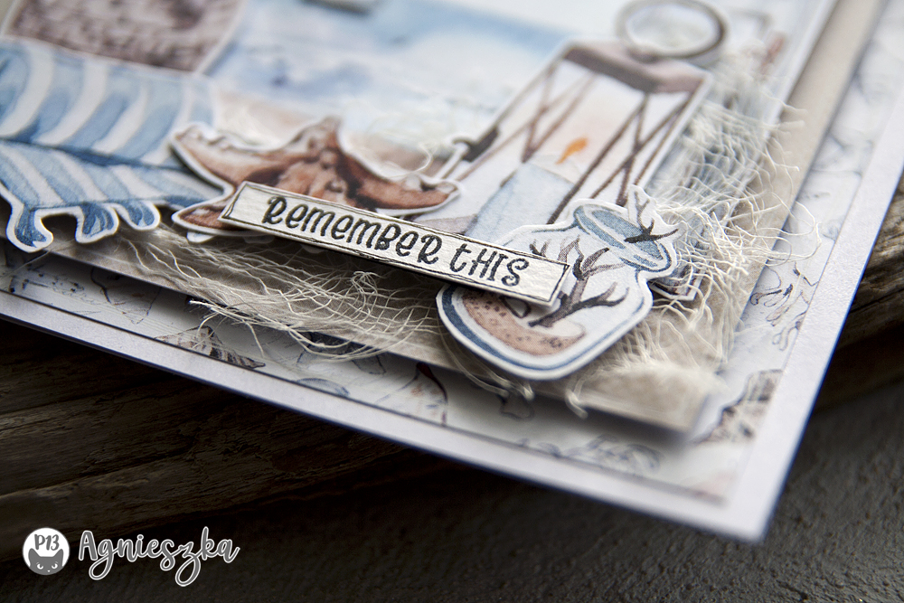 My today’s inspiration is definitely in the summer theme. The latest papers’ collection „Beyond the Sea” will be perfect for both summer time cards and albums, as well as on thematic ones, such as a birthday in a maritime theme, etc. Apart from papers, I also used the inscription from the set of stamps from this collection. Did you notice that the artwork in this set looks familiar? Take a look at the older collection „Off Shore II”, you will find the answer there. I am personally delighted!
