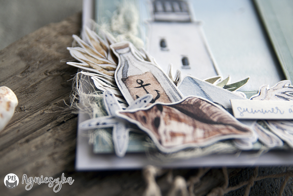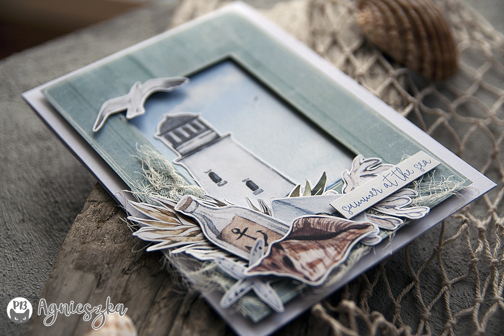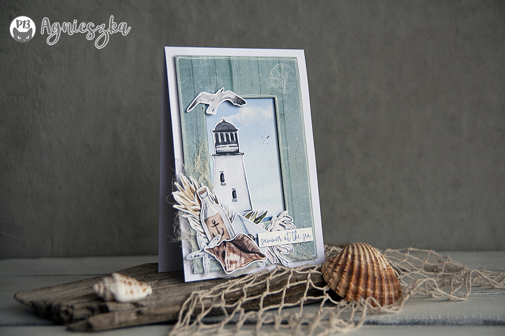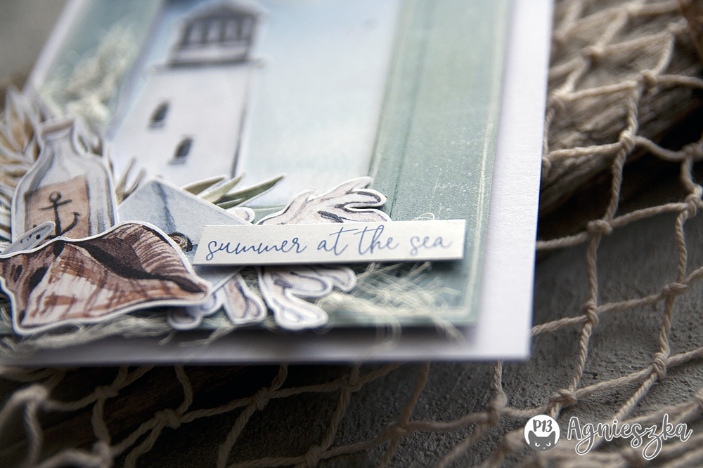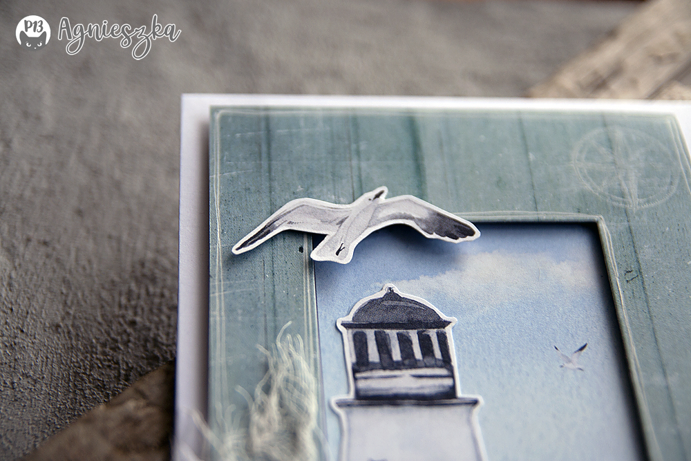 My inspiration for you today is another card in a maritime theme for various occasions. To make this card, I have used not only papers from the „Beyond the Sea”, collection, but also stamps and accessories from this collection, such as an inscription from a stickers’ sheet. However, I extended my work with one more element – the basis of the composition, blue planks, consist of a paper from the new „Wood” creative pad collection. It contains a set of great graphics of wooden floors and doors that add extra to any work, regardless of the theme.