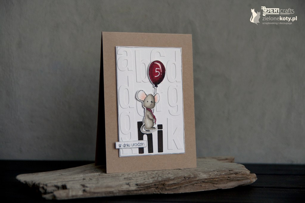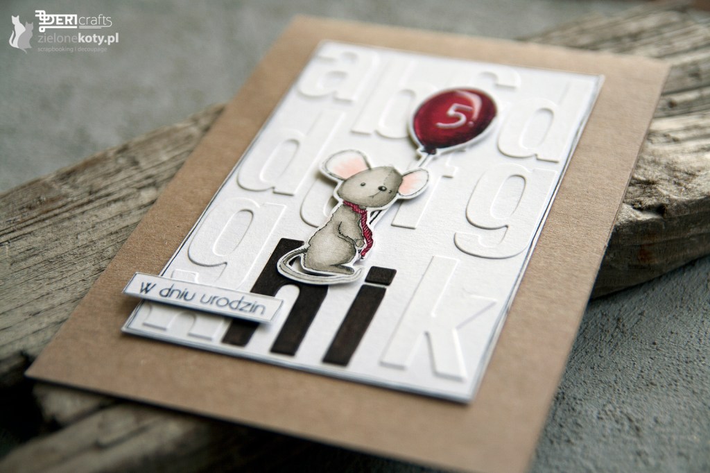 My today’s inspiration for you was influenced by the latest challenge on the blog of Zielone Koty, entitled: “Letters and numbers”. The topic is very extensive, so you can go crazy, this time I decided on a simple Birthday card for a little boy or girl. In presented work I used letter dies to make a background. As always, I drew the frame by hand with a black fine liner. I have arranged the letters so that they form the word “Hi” at the bottom of the page. Thanks to this, a base was created for placing a mouse with a balloon on which, using a number die, I pasted the number of years of the birthday person. I coloured the decorative elements and the inscription with alcohol inks. As always, I installed the whole thing on a solid and reliable base made of Rzeczy z Papieru company. The work was finished with an inscription appropriate to the occasion, which I also outlined with a black pen.