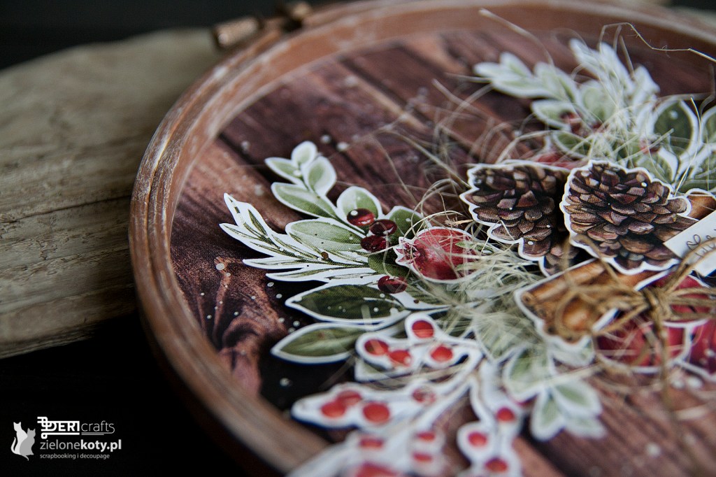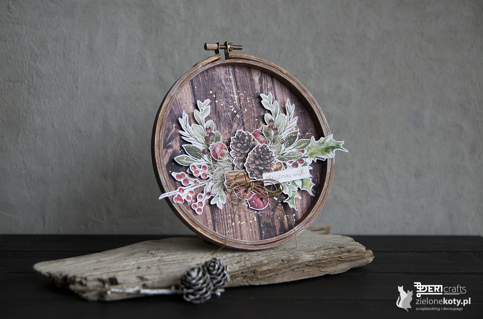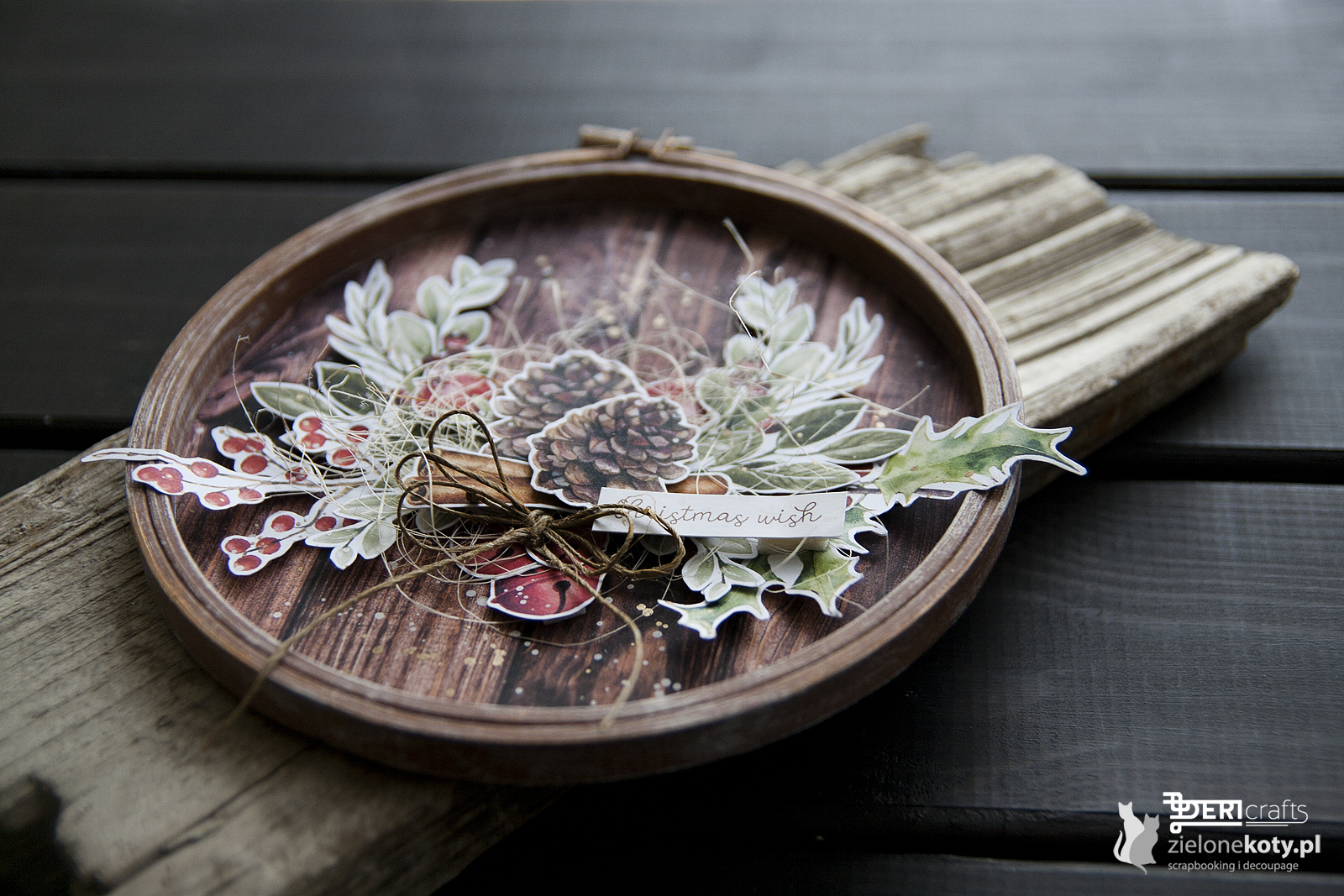 My today’s proposal is based on a wooden hoop, which is so fashionable this season. I made the composition and background of scrapbooking papers, I added a bit of sisal to make the work three-dimensional and finished it with splashes of gold and white paint. I completed the whole with an appropriate inscription and this is how a neo-folk Christmas decoration was created, to be hung, for example, on the door.