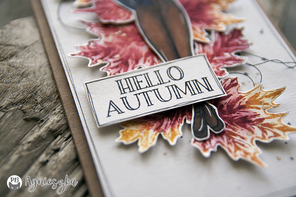 Moja druga inspiracja dla was jest nieco inna niż te do tej pory. P13 znamy głównie poprzez cudowne zestawy papierów. Od niedawna jednak firma posiada w swojej ofercie niezależne od kolekcji zestawy stempli, ale doskonale do nich pasujących. W mojej inspiracji wykorzystałam stempel- dziewczynę z zestawu „Polly” który pokolorowałam tuszami alkoholowymi, a że mamy już pełnię jesieni, to kompozycję wokół niej ułożyłam z odbitek stemplowych liści z kolekcji ‚The Four Seasons- Autumn” w technice akwarelowej. Dla urozmaicenia kompozycji dodałam czarną nitkę i parę chlapnięć złotą farbką. Pracę zamyka napis, który również jest odbitką stempla z tej samej kolekcji.