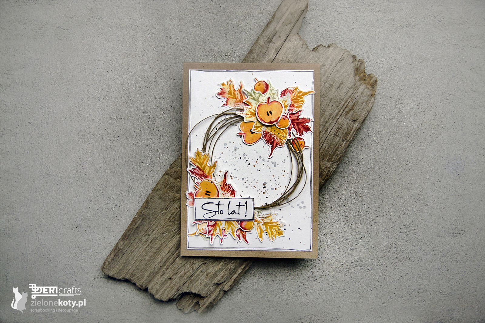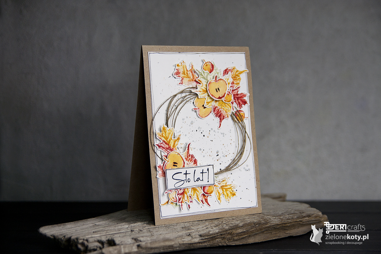 This time I have prepared an autumn inspiration for you, but using only a set of stamps. I stamped and coloured the prints with distress inks and then cut them out. So that the work was not so flat, I used a linen string as a wreath. I added, as always, a hand-drawn border, a few golden and black splashes, and an inscription appropriate to the occasion. I hope that my autumn, simple composition will inspire you to create works on the autumn theme.