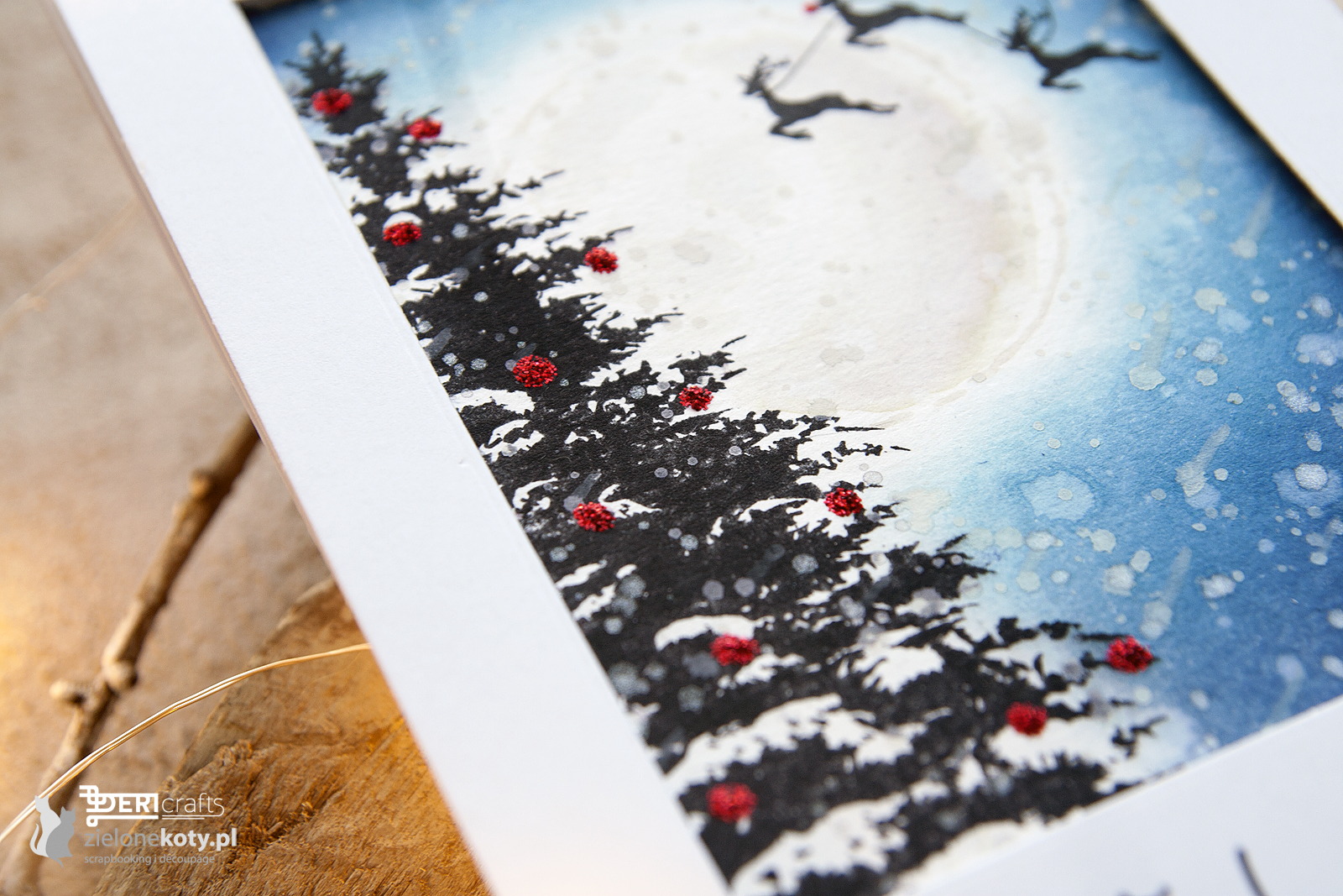 A few days ago, there was another live which I done for ZieloneKoty.pl on their fanpage, this time a card with a Christmas theme. During the live, I prepared a simple card for you, using several colours of Distress inks and two types of polymer stamps – a Christmas tree and an appropriate inscription. So if you are interested in this subject, I invite you to watch the live replay (only in Polish language unfortunately).