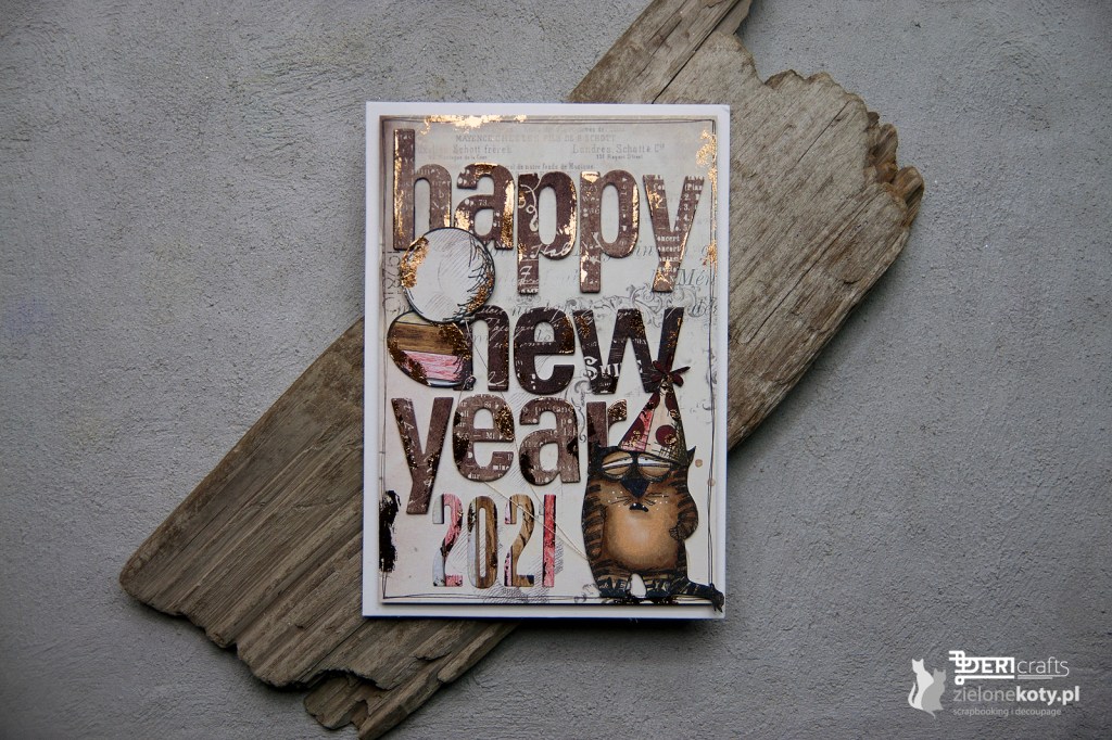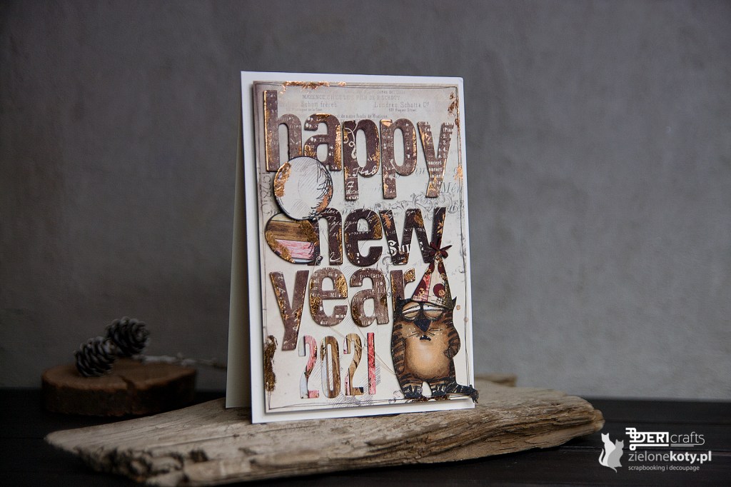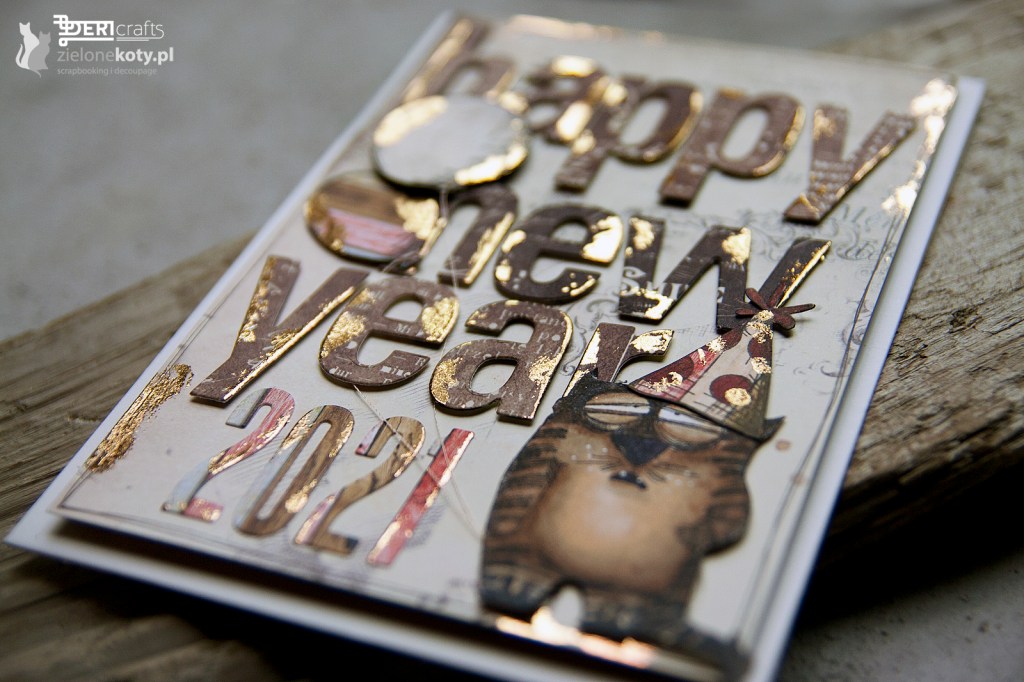 Nowy Rok, czyli 2021 trwa już tydzień, ale nadal jeszcze jest czas na wysyłanie kartek z życzeniami na tę okazję. Jak zawsze, moja kartka jest nietypowa. Po pierwsze, 2020 dał nam równo w kość tym co się działo, tak że finalnie w 2021 weszliśmy wymęczeni – jak ten kotek. Po drugie, życie było tak wykrzywione jak te nierówno ułożone literki. W końcu, mamy nadzieję, że nowy rok będzie jednak lepszy, po mimo wszystko, co symbolizują złocenia, których jest aż nadto, bo tak wielkie nadzieje pokładamy w ten 2021.