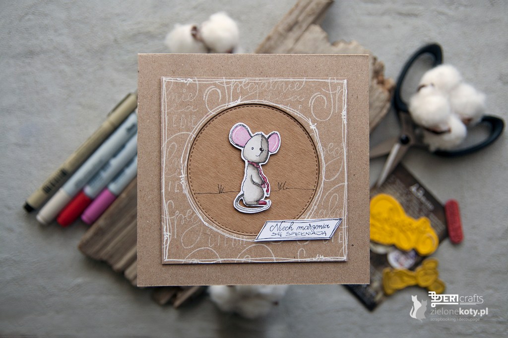 Today I come to you with inspiration on a clean and simple card. Many of you are still reluctant to use or color stamps, not to mention building entire compositions out with them. So today, especially for you, a card super simple, but still with the use of 3 stamps. In this work, the “most difficult” element is coloring the mouse, but if you are afraid of this (although I sincerely encourage you to try it), even a figure that is only stamped with black ink on a white paper and cut out will also fulfill its role.