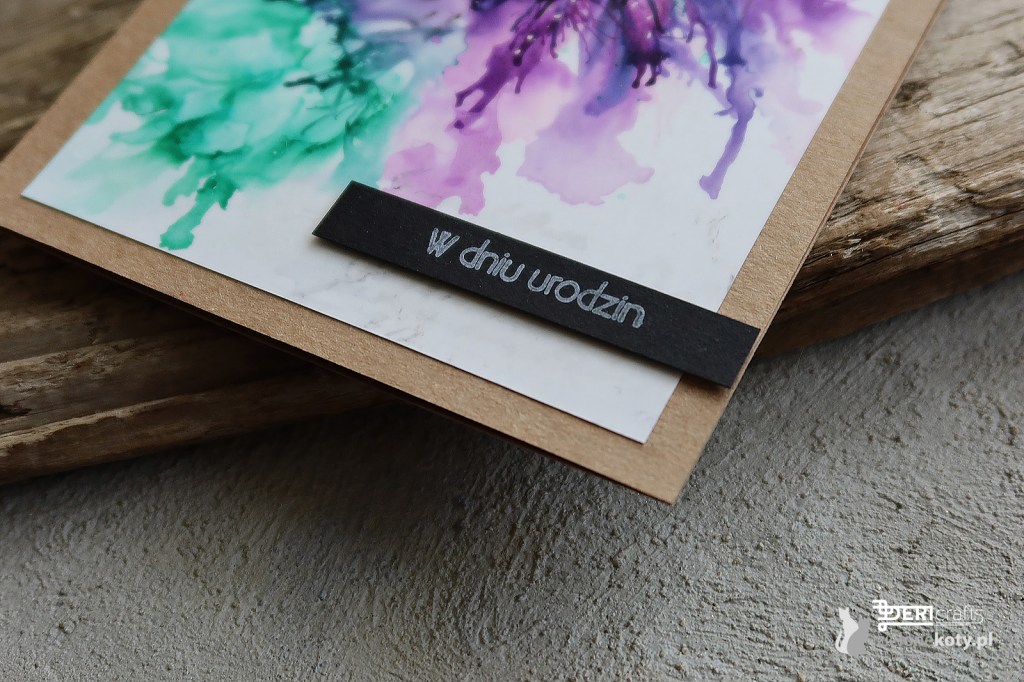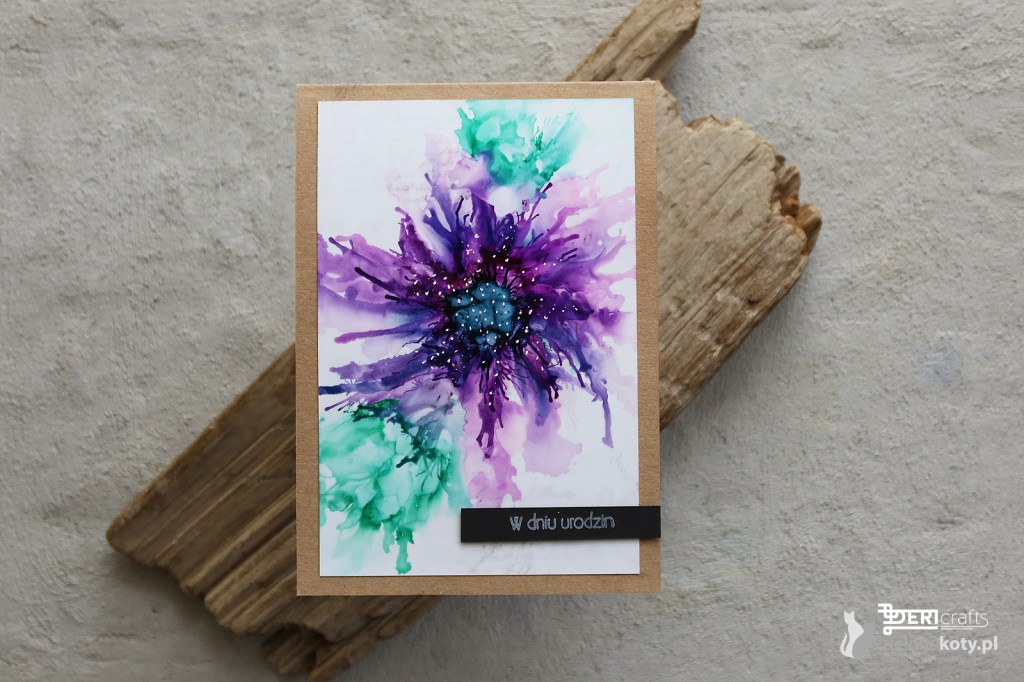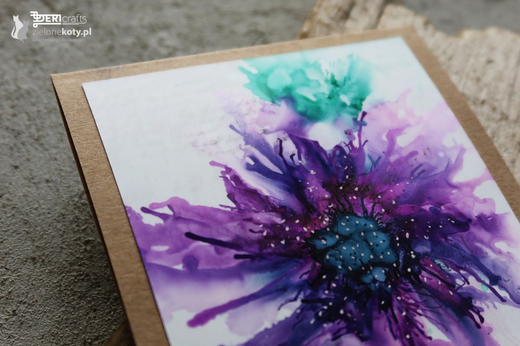 Moja dzisiejsza inspiracja dla was doskonale wpisuje się w nasze najnowsze wyzwanie Zielonych Kotów “Wiosenne impresje”. Kompozycję kwiatową wykonałam całkowicie za pomocą tuszów alkoholowych na specjalnym “papierze” plastikowym. Tusze alkoholowe nadal są dla mnie pewną zagadką, bo z jednej strony ciężko kontrolować ich przepływ na kartce, ale z drugiej wykorzystując podmuch bądź to ze specjalnego narzędzia (gruszka) czy suszarki, do pewnego stopnia jestem w stanie nadać tuszom żądany przeze mnie kierunek i kształt. Niemniej muszę przyznać, że praca z tym medium jest szalenie satysfakcjonująca i ciągle testuję nowe możliwości na ich wykorzystanie.