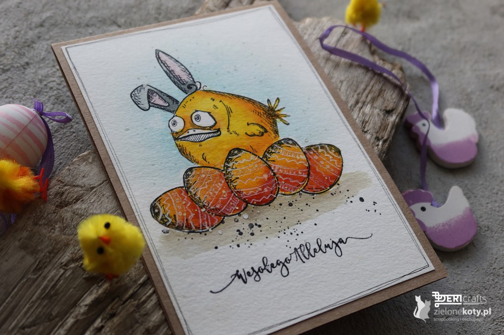 Easter is just around the corner, so it is a great time to prepare works on this subject. On the last LIVE, I showed you a relatively simple technique for painting one-dimensional cards using stamps, masks and water distress inks. You can find all the details on the replay LIVE saved both on the fanpage ZieloneKoty.pl and on the YouTube channel.