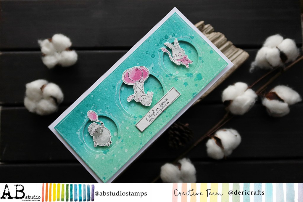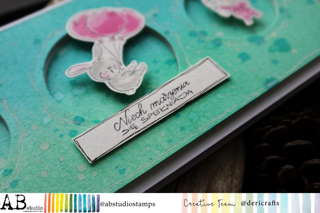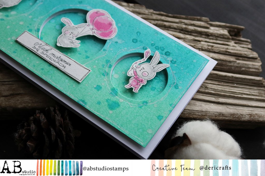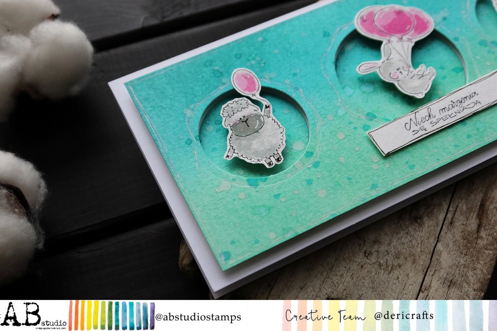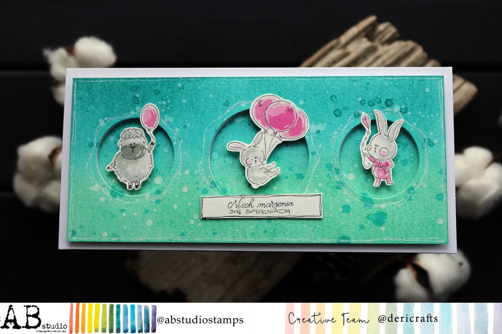 Here is the card from International Scrapbooking Day which I have done during LIVE at A.B.Studio fanpage! I used three cute animal stamps: hare with kite ID-1014 “cute hare”, sheep with balloon ID-976 “birthday sheep” and bunny with balloons “bunny” ID-705. Of course there always has to be a suitable inscription and for this card I have chosen: ID-612 “niech marzenia się spełniają”. If you have missed the LIVE, don’t worry, you can view it anytime on A.B.Studio fanpage or directly on my YouTube channel, link to it you can find below 🙂