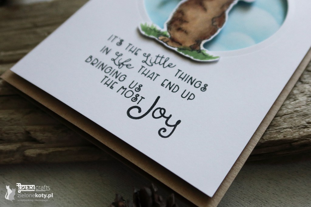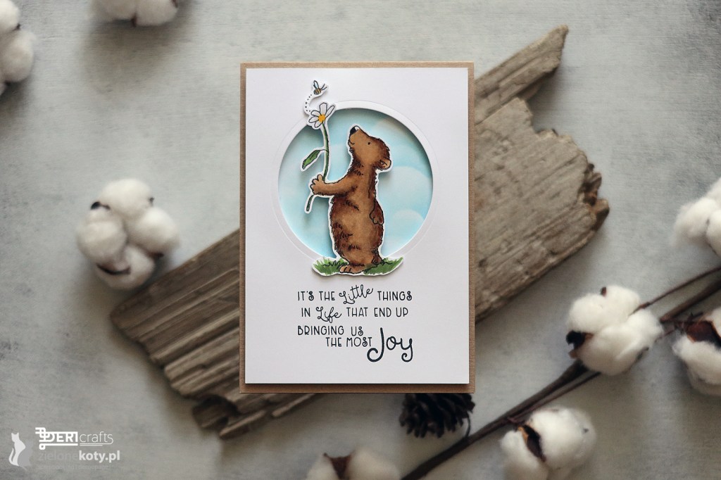 My first June inspiration is a card on occasion – no occasion, in a clean and simple style. This time I reached for a set of stamps with charming drawings by Anita Jeram and produced by the Colorado Craft Company. The main theme is a teddy bear with a flower, which I placed on a blue background made with a cloud mask and Tumbled Glass distress oxide ink. Due to the fact that the inscriptions in this set have been fantastically matched to the stamps, I decided to use them too. As always, I mounted everything on foam tape and a kraft base. This is how a simple and cute card for various occasions was created.