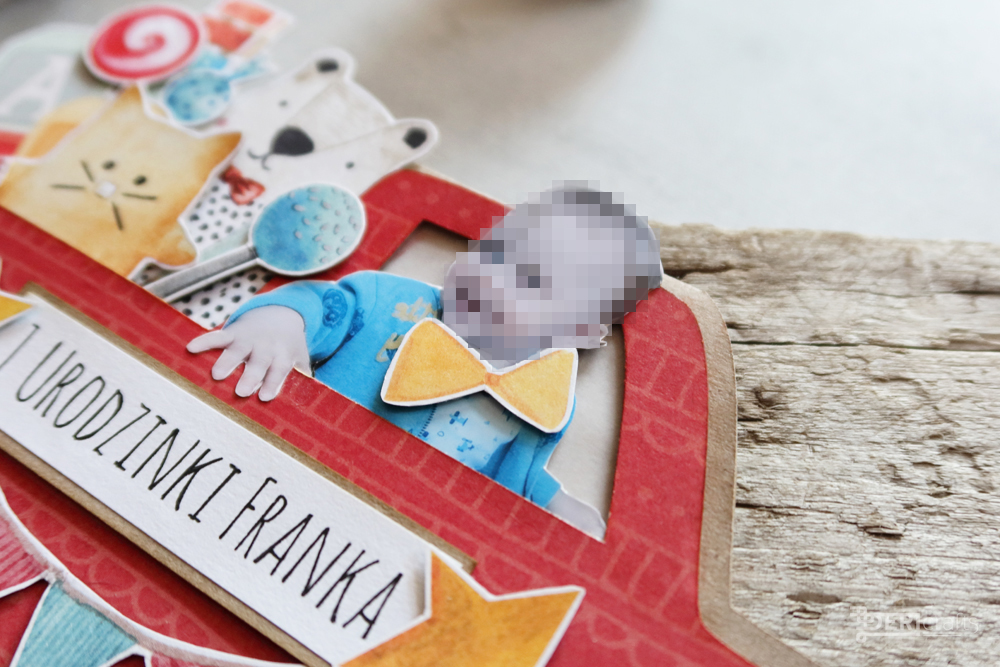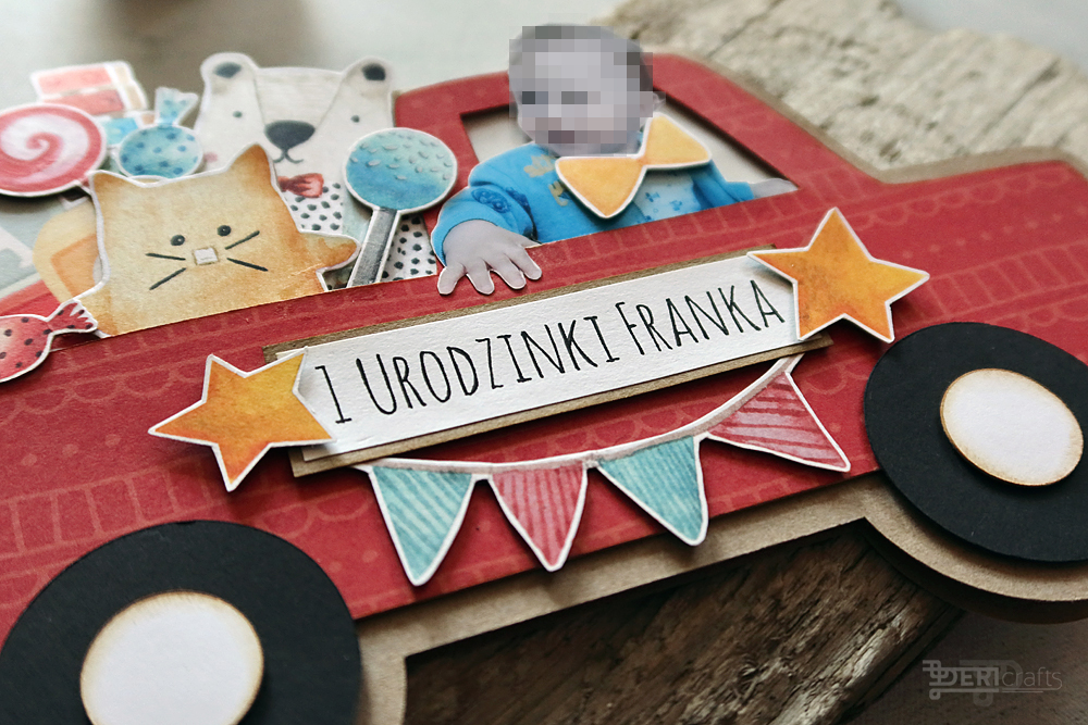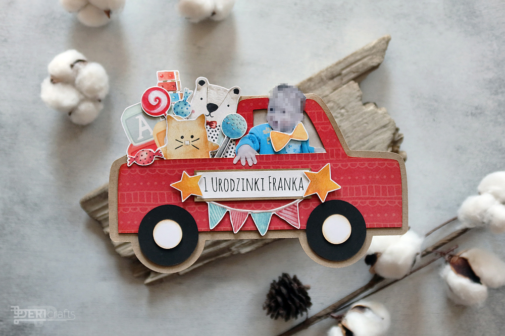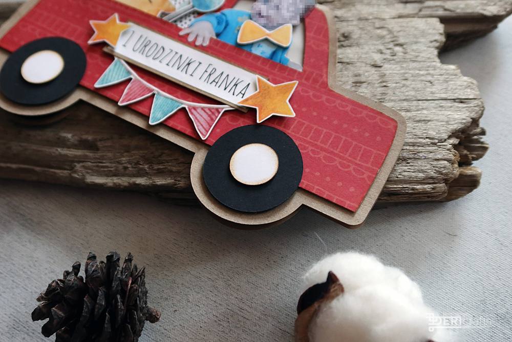 I often writes in social media that I love your individual orders, especially those with unusual shapes. This time I prepared a cute birthday car, built on a craft base and scrapbooking papers. In addition, great photo of the birthday boy, who perfectly fit into the driver’s seat, and this is how a nice and colourful card for the 1st birthday was created.