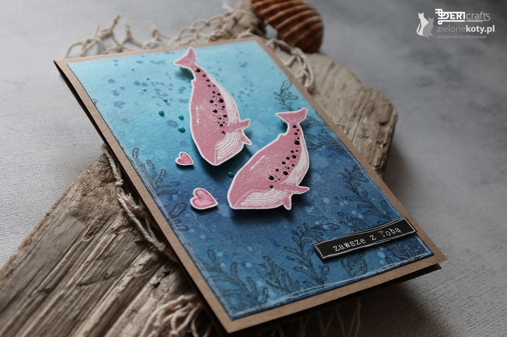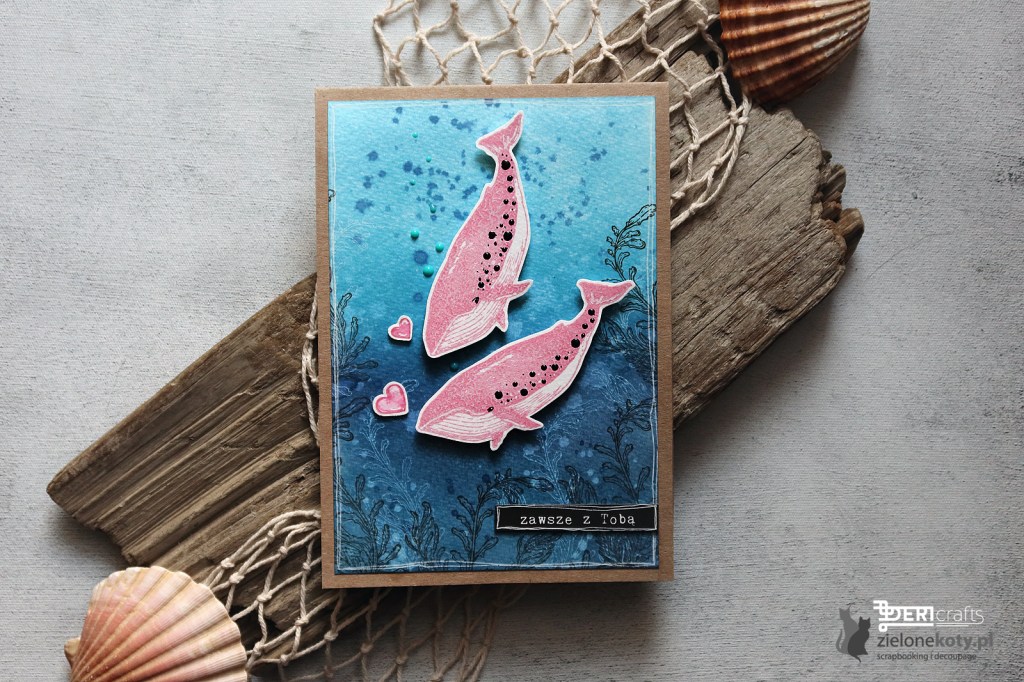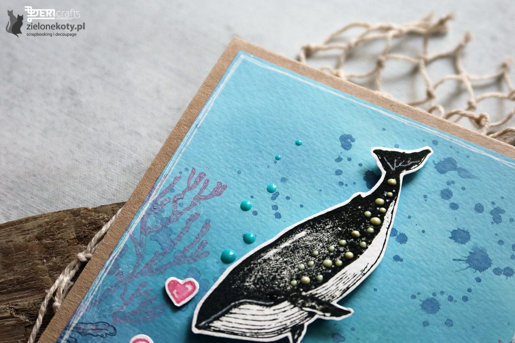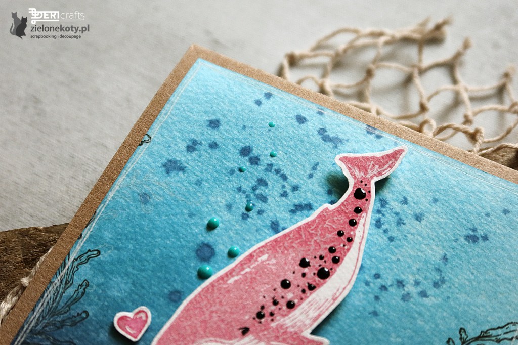 The presentation concerned not only blenders, doubers and brushes, but also the surfaces and papers necessary to achieve the best results in ink background creating (mainly with Distress and Oxide inks). The topic of hygiene and caring for this type of tools was not omitted either. During LIVE, several backgrounds were created showing the differences in inking between the Distress Ink and Oxide, but also the differences resulting from the use of appropriate papers or types of tools. In the gallery below you can see works that were created on the basis of 2 types of backgrounds. The one with pink whales have a background made with the Distress Ink with usage of a mini blender with a dome sponge. The work with black whales – this is the Oxide background made with the help of brushes.