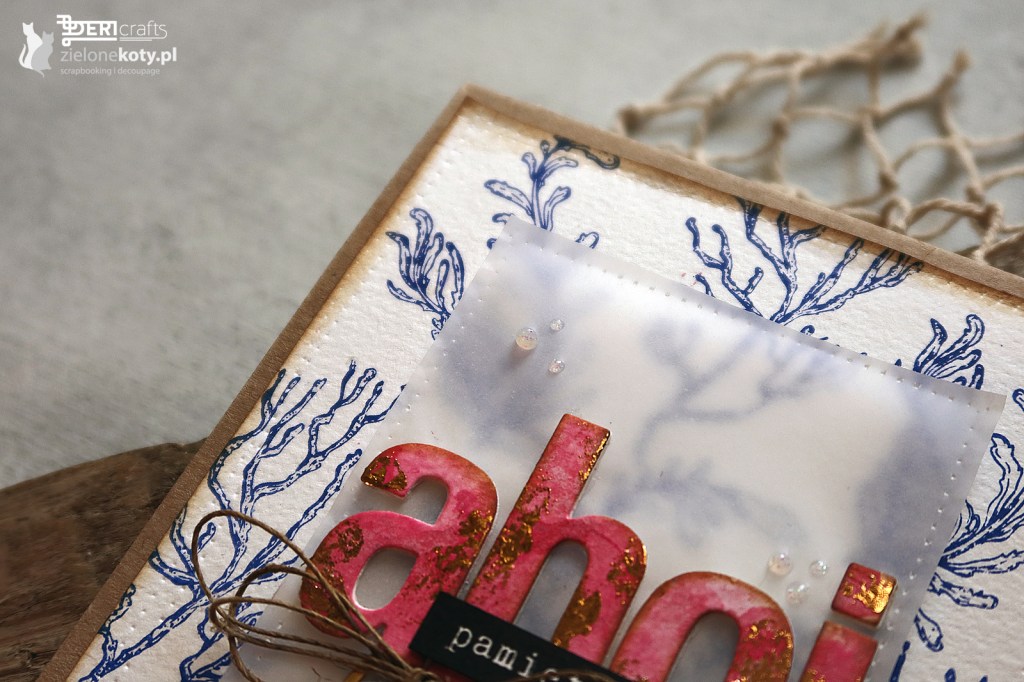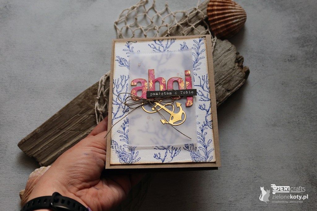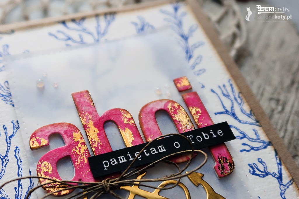 Moja dzisiejsza inspiracja dla was zainspirowana została najnowszym wyzwanie w Zielonych Kotach “Festiwal Kolorów”. Tym razem jednak, postanowiłam do tematu podejść nieszablonowo i zamiast feerii kolorów postawiłam na kolory podstawowe. Zatem złoto to reprezentant koloru żółtego, różowy – to oczywiście pochodny czerwieni a granat wiadomo – niebieski. Dodatkowo czerń i biel dopełniają kompozycji (no i oczywiście nie mogłam pohamować się i nie dodać odrobiny brązu – tak trochę nielegalnie na tym festiwalu się znalazł 😉 ). Wszystko to upakowałam w mały format kartki i dodałam delikatnych acz mieniących się kolorami tęczy kropelek Nuvo, co ostatecznie zamknęło kompozycję mojej pracy. Tak oto powstała całkiem zgrabna kartka w tematyce marynistycznej.