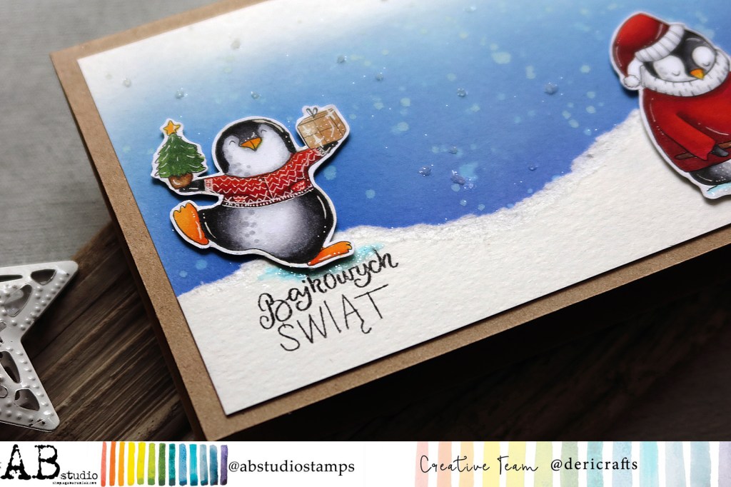 Although summer is still in, here in our crafting world, preparations for the Christmas season are in full swing. Hence the new @ ab.s.t.u.d.i.o stamps collection has appeared. To make this card I have used 3 cute penguin stamps from the new release: one with a snowball (or round belly, depends what you choose ;)) (ID-1260), one with a shovel (ID-1259) and one with a Christmas tree and a gift, dressed up in a cute winter sweater (ID-1257). To finish the composition I have used, suitable for the occasion, sentence (ID-606).