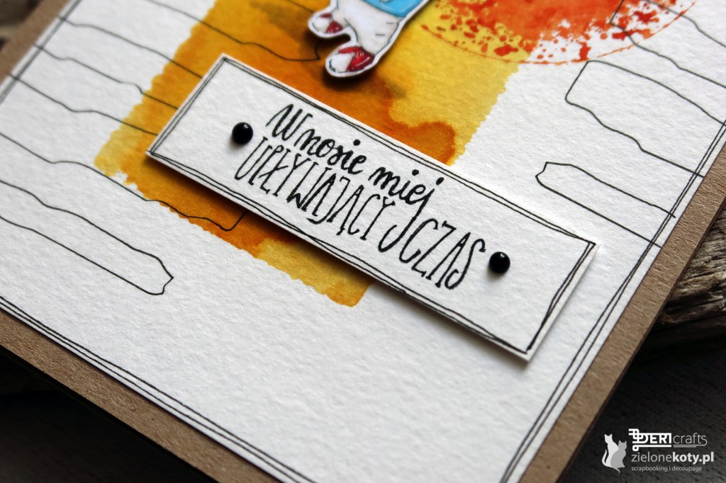 My today’s inspiration for the ZieloneKoty.pl store is exceptionally not for a child, although the graphics could suggest something else. However, I specially combined the graphics of a cute bunny with a rather modern background pattern, so that the whole thing could be intended for an adult (from teenagers to the elderly). As always, the card was kept in a clean & simple style. To make it, I used a stamp with a bunny graphic and a mask with irregular stripes. The background shape, on the other hand, is the Distress ink patterns made with usage of the stamping blocks. The whole work was finished with an inscription, as always appropriate to the occasion.
