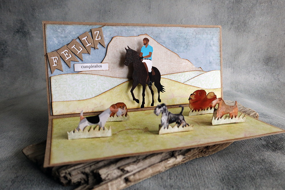 I don’t know if you know, but I really like to make interactive cards. This time a birthday card for an exceptional horse and dog lover. For this type of work, I decided to use the pop-up mechanism, but mounted directly on the ground. This has its advantages and disadvantages, in the future I have to refine the mechanism so that the elements placed on the front of the set can rise by themselves, but I am still happy with what came out.