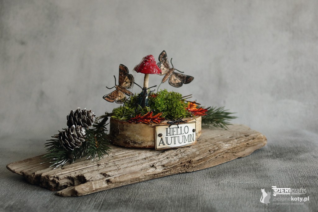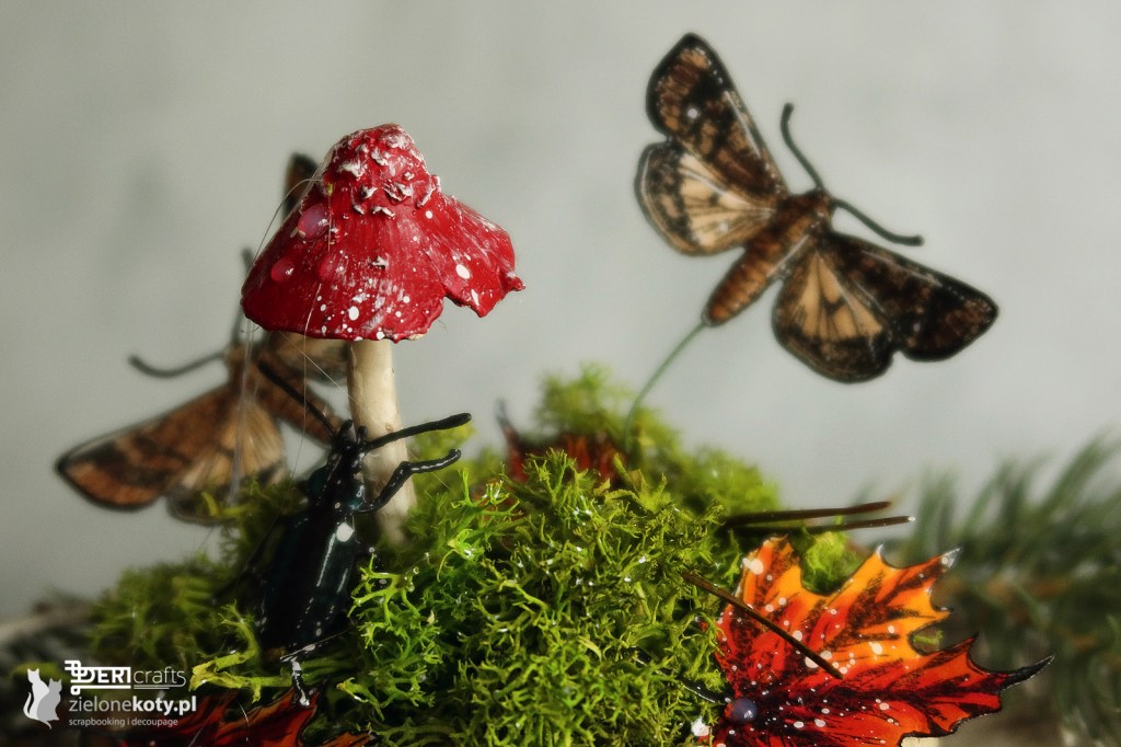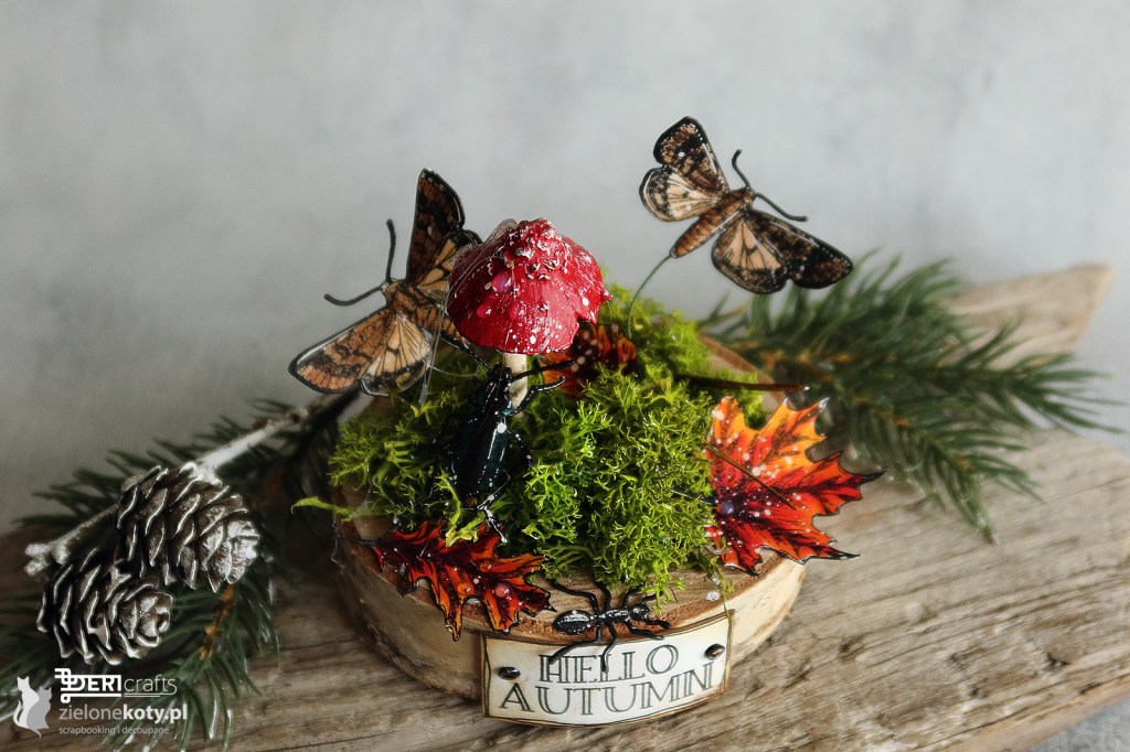As you have already noticed, from time to time, I give up my beloved cards to experiment in other forms. This time I decided to prepare an autumn home decor to please me with its warm colours, when the autumn will be moody and rainy. And because I am an avid lover of stamps, they could not be missing from this composition. Stamps-bugs from Tim Holtz stamp set worked great here, as well as wonderful little leaves from P13 Paper Products. And because the subject of the challenge for which I prepared this work as an inspiration for you, and which was launched a few days ago on the store’s blog, is “closer to nature”, of course I used natural elements in the composition, such as a wood slice and green moss. I closed the whole composition with an inscription, added a few liquid pearls, and finally everything was gently sprinkled with my favourite white paint – colorex. The composition I present can be placed as it is, but you can also disenchant Christmas balls and place the decor there, thus obtaining the effect of a closed forest in a jar (as you can see in the pictures below).