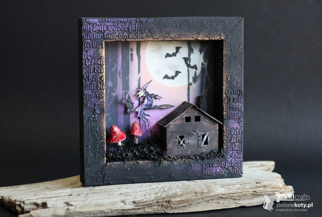 Skoro już październik, to czas i na prace zarówno jesienne jak i Halloween’owe. Mimo że święto to nie jest tak popularne w Polsce jak w innych krajach, to wśród nas znajdą się jego fani. Ja osobiście najbardziej lubię dekoracje w tej tematyce, dlatego tworząc nową inspirację dla @zielonekoty.pl ponownie wykorzystałam shadow box i domki 3D, ale tym razem dorzuciłam do scenerii chrobotka, którego przemalowałam czarnym gesso, oraz żywicowe grzybki, którym kolor nadałam farbą akrylową. Brzegi boxa ozdobiłam fakturą utworzoną z pasty grit, którą również miejscami położyłam przez maskę. Całość wykończyłam metalicznymi woskami.
