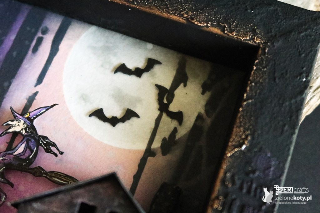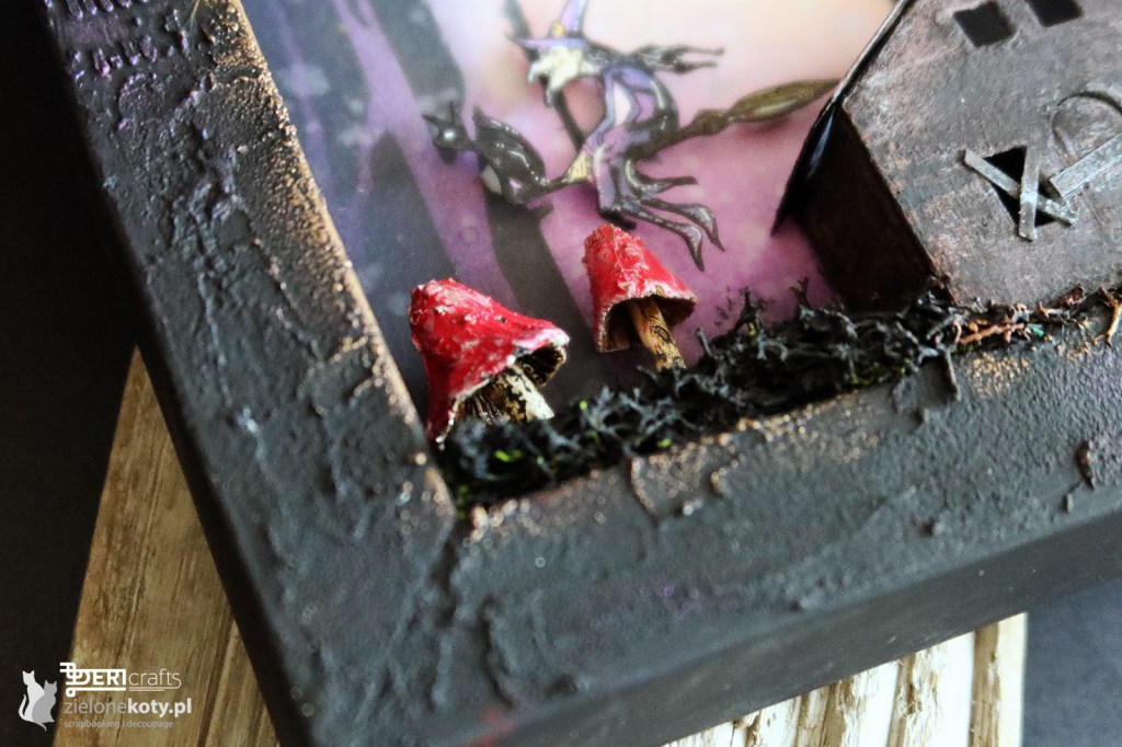 Since it’s October, it’s time for both autumn and Halloween works. Although this holiday is not as popular in Poland as in other countries, there will be fans of it among us, including myself. I personally like decorations in this topic the most, so when I was creating a new inspiration for @zielonekoty.pl , I used the shadow box and 3D houses again, but this time I added a moss, which I repainted with black gesso, and resin mushrooms, the colour of which I painted with acrylic paint. I decorated the edges of the box with a texture grit paste, which I also put through the mask in some places. I finished the whole decoration with metallic waxes.