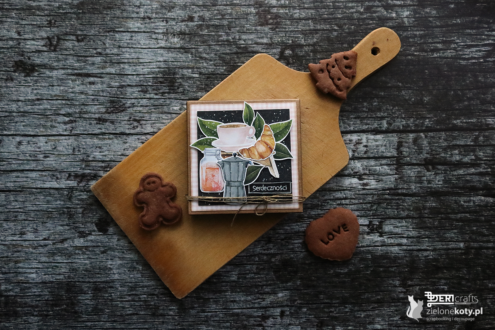 Being inspired with the topic of the challenge on ZieloneKoty.pl blog, I have prepared another general-kitchen inspiration. This time it is a small chocolate box for small sweets, perfect, for example, to give a few delicious gingerbreads, and not necessarily chocolate itself. These types of bases that I used for inspiration are perfect for packaging charming items, including jewelry. But let’s get back to the kitchen topic. I decorated the box simply, using only printed papers and a stamp appropriate to the occasion. Finally, I decided to use a string as an element holding the flap so that the chocolatier does not open, but you can give magnets or mini Velcro instead.
