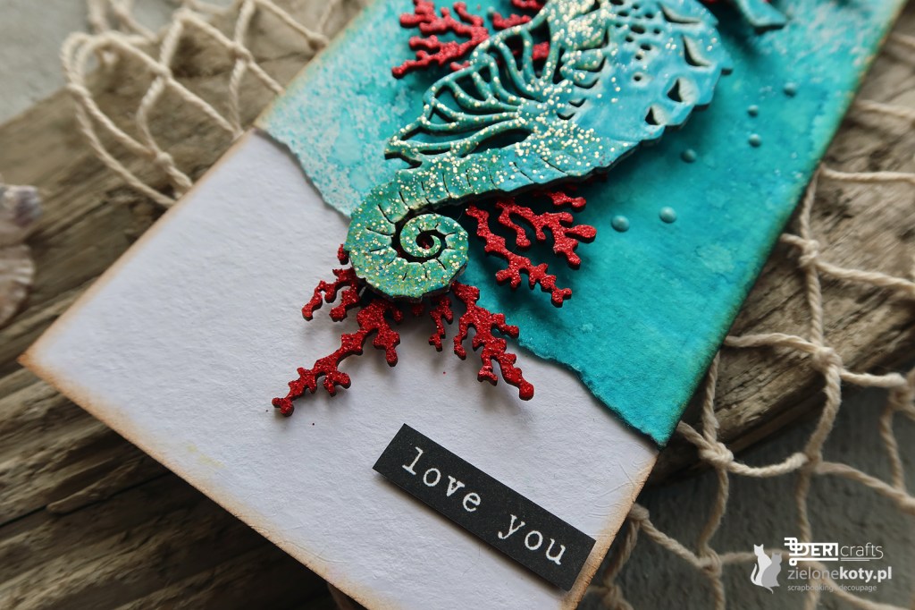 Skoro mamy już lipiec i pełnia lata, to nie może zabraknąć pracy w tematyce morskiej i taką inspirację dla was dzisiaj przygotowałam. Tym razem nie kartka, a tag, który świetnie sprawdzi się jako bilecik do głównego prezentu, choć sam w sobie stanowi również fajna dekorację do postawienia lub powieszenia. Do zrobienia taga wykorzystałam wykrojnik Tima Holtz’a w takim kształcie, tekturki od SnipArt oraz tusze Distress. Blasku dodały pudry do embossing’u z brokatem. Całość jak zawsze wieńczy stosowny napis.
