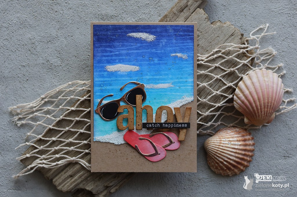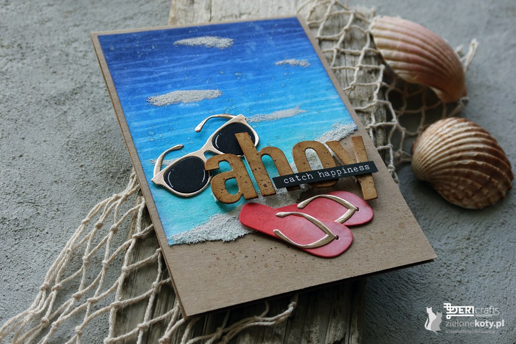 Once again, inspired by the challenge topic run on the Zieloni Kotów blog, I have prepared a summer holiday inspiration for you. We’re going on a trip – this is the topic of the newest challenge, and where? Of course, to the seaside! Therefore, the card also includes classic summer accessories, i.e. fashionable sunglasses and flip-flops. I colored all the elements with Distress inks, and the gilded accessories were cut out of mirror paper. As always, I closed the whole composition with an appropriate inscription.