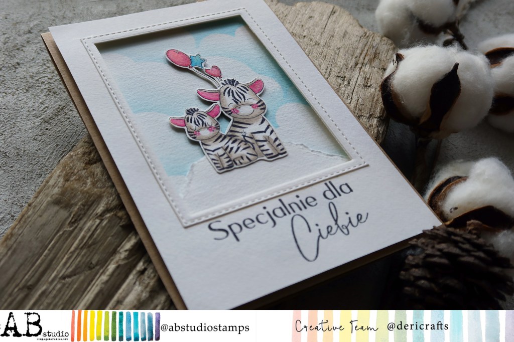 Oto, wyjątkowo, kolejna inspiracja dla Ciebie, stworzona dla @abstudiostamps z produktami @ab.s.t.u.d.i.o. Tym razem jest to kartka urodzinowa z super słodkimi zebrami. Do jej stworzenia użyłam trzech stempelków: uroczych zebr (ID-1130), balonów, które trzymała sowa (ID-974) oraz odpowiedniego napisu (ID-153). Podłoże zostało wykonane przy użyciu tuszy Distress i maski w kształcie dużych chmur (ID-175).