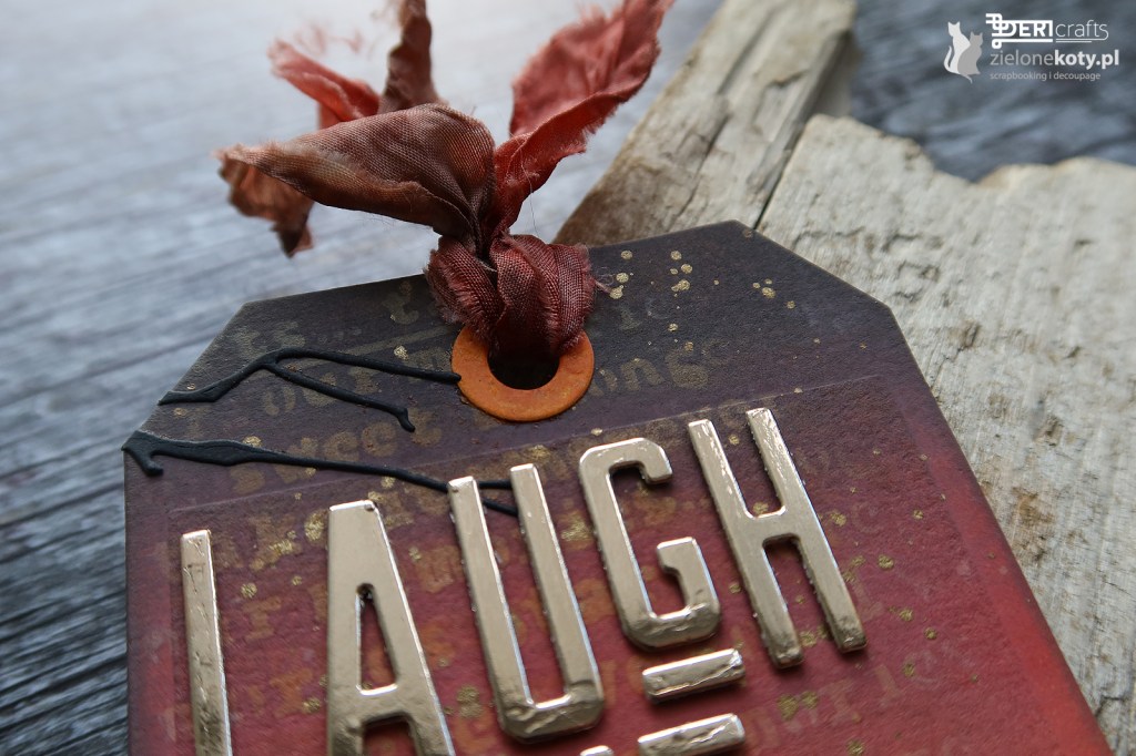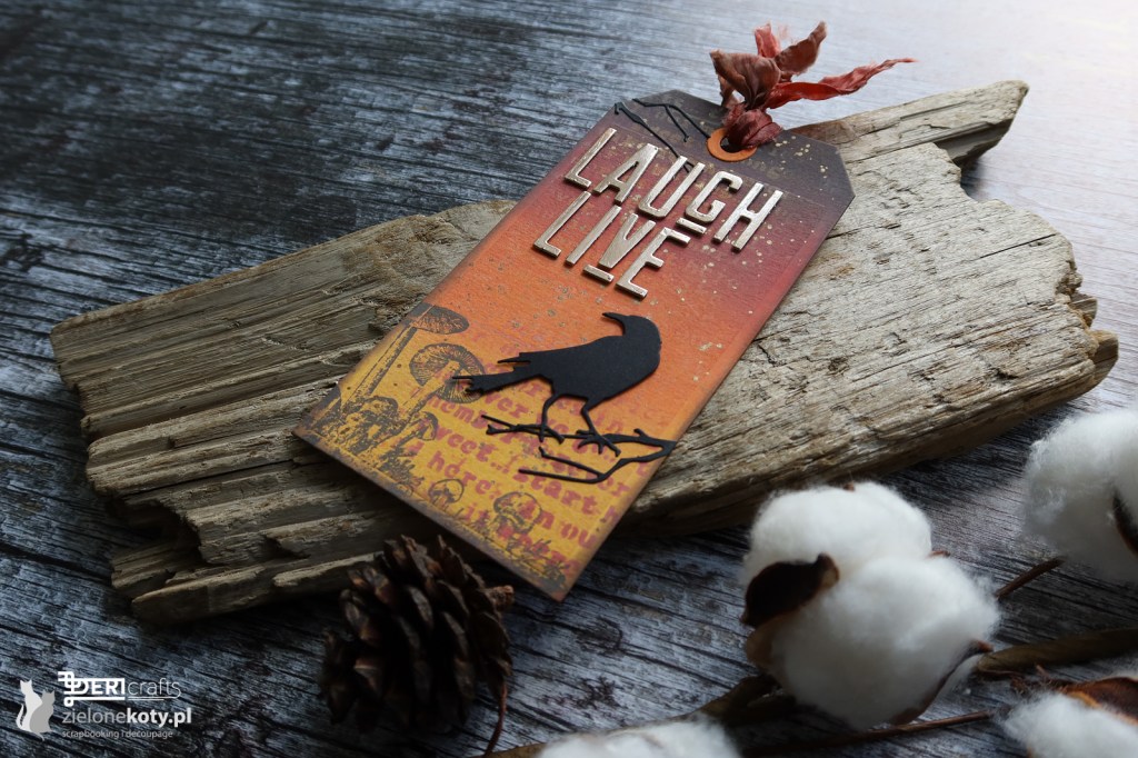 My today’s inspiration for you was inspired by the latest challenge on the blog Zielonekoty.pl “Colors of Autumn”. This time, however, it is not a card, but a tag. It was created as an autumn decoration for my studio and it contains almost all the symbols of autumn, i.e. colors, mushrooms and rook / raven. The background of the tag was created from the Distress Oxide inks, which is why the inscriptions are bright against a dark background – this is one of the few nice features that these inks have. The main character is a beautifully shiny inscription and more subtle golden splashes. The whole work is dressed up with ribbons dyed with distress inks in the same colors as those used on the background.