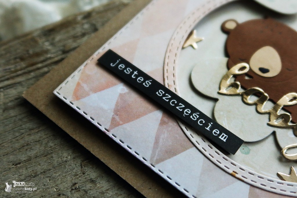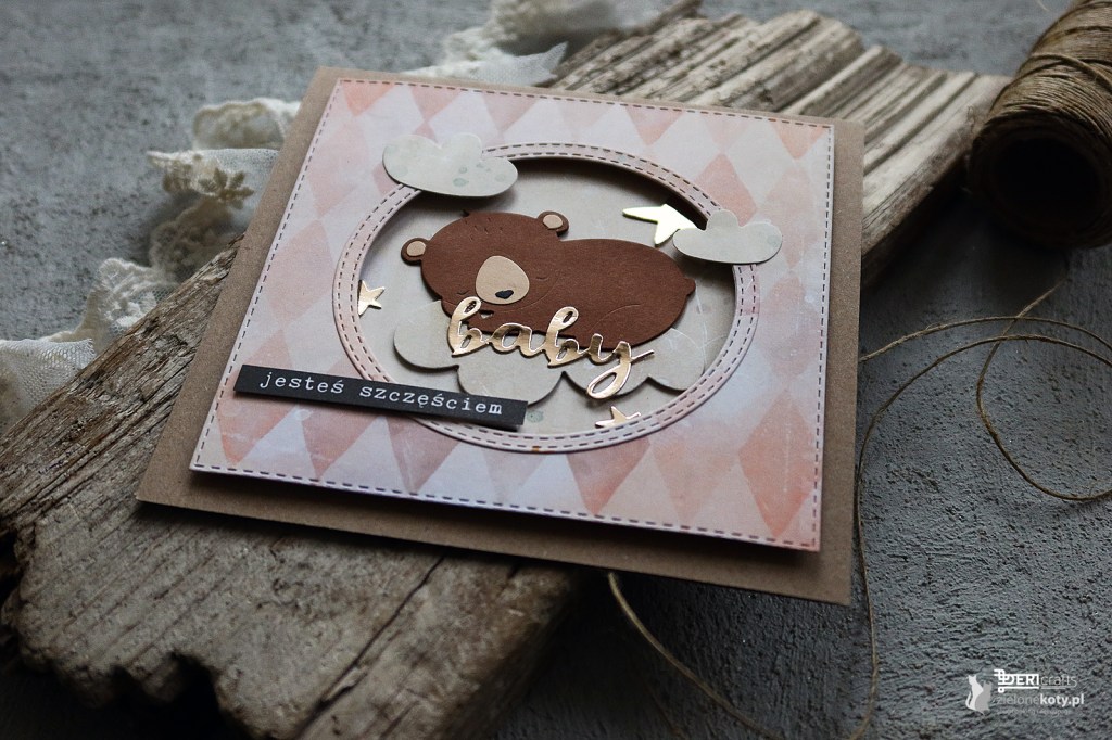 s part of the latest inspiration for zielonekoty.pl store, I have prepared for you a birthday card for a baby. I used lovely Sizzix dies and scrapbooking papers. Although the card is simple in its form, a bit of glitter in the form of golden mirror paper gives it a subtle elegance. The card will work great as a gift for a child’s birthday, but also as an addition to congratulate the future mother.
